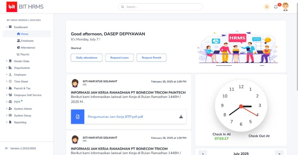 Home Kelola HR Lebih Mudah dan Terintegrasi dengan BIT HRMS Cepat, aman, dan mudah disesuaikan. Lihat Fitur Coba Demo Mengapa Memilih BIT HRMS? ✔ Dikembangkan sesuai kebutuhan internal perusahaan ✔ Integrasi sistem absensi, payroll, pajak, dan struktur organisasi ✔ Tampilan sederhana dan mudah digunakan ✔ Dukungan teknis langsung dari tim pengembang ✔ Mempercepat proses administratif HR Fitur Unggulan